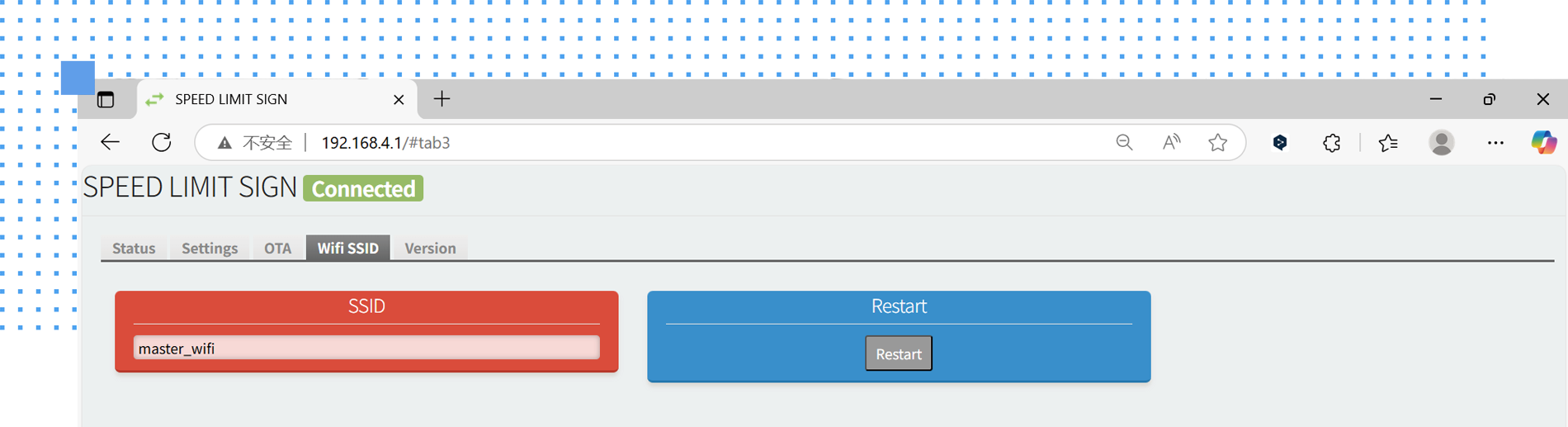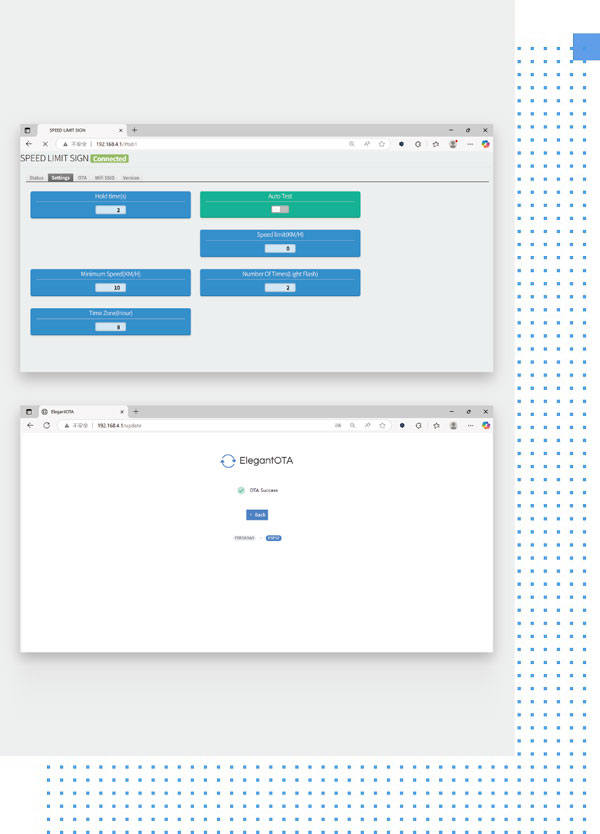YAHAM team provides a web-based local control platform designed specifically for the radar speed limit sign. The platform includes five functional modules: Status, Settings, OTA (Over-The-Air upgrade), WiFi SSID and Version information.